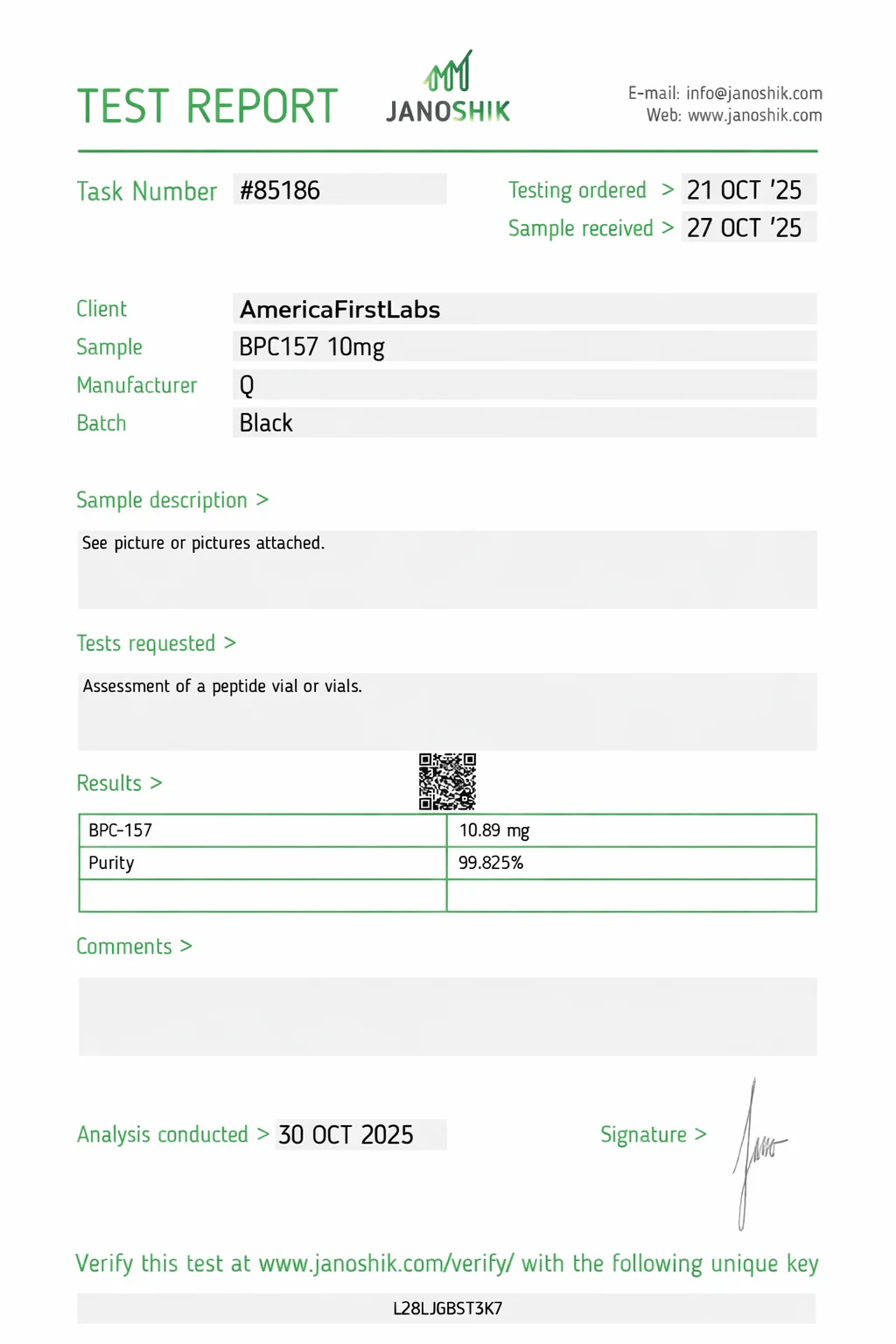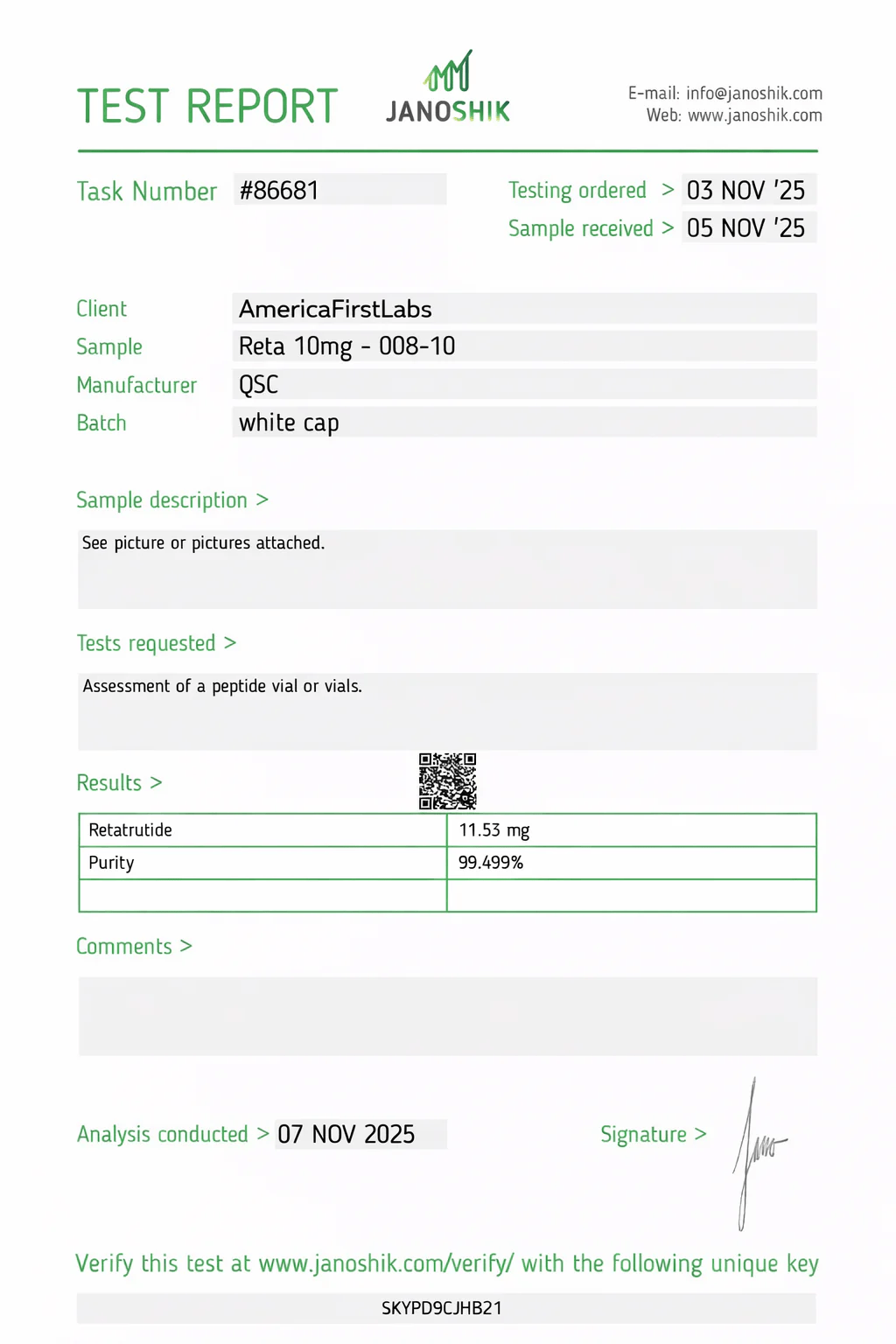 We provide batch specific report that verifies the peptide’s identity, purity (≥99% as tested), quantity, and quality through advanced analytical methods including HPLC. Every vial includes full COA documentation for complete research transparency. Strictly for laboratory and scientific research purposes only not for human or veterinary use.
